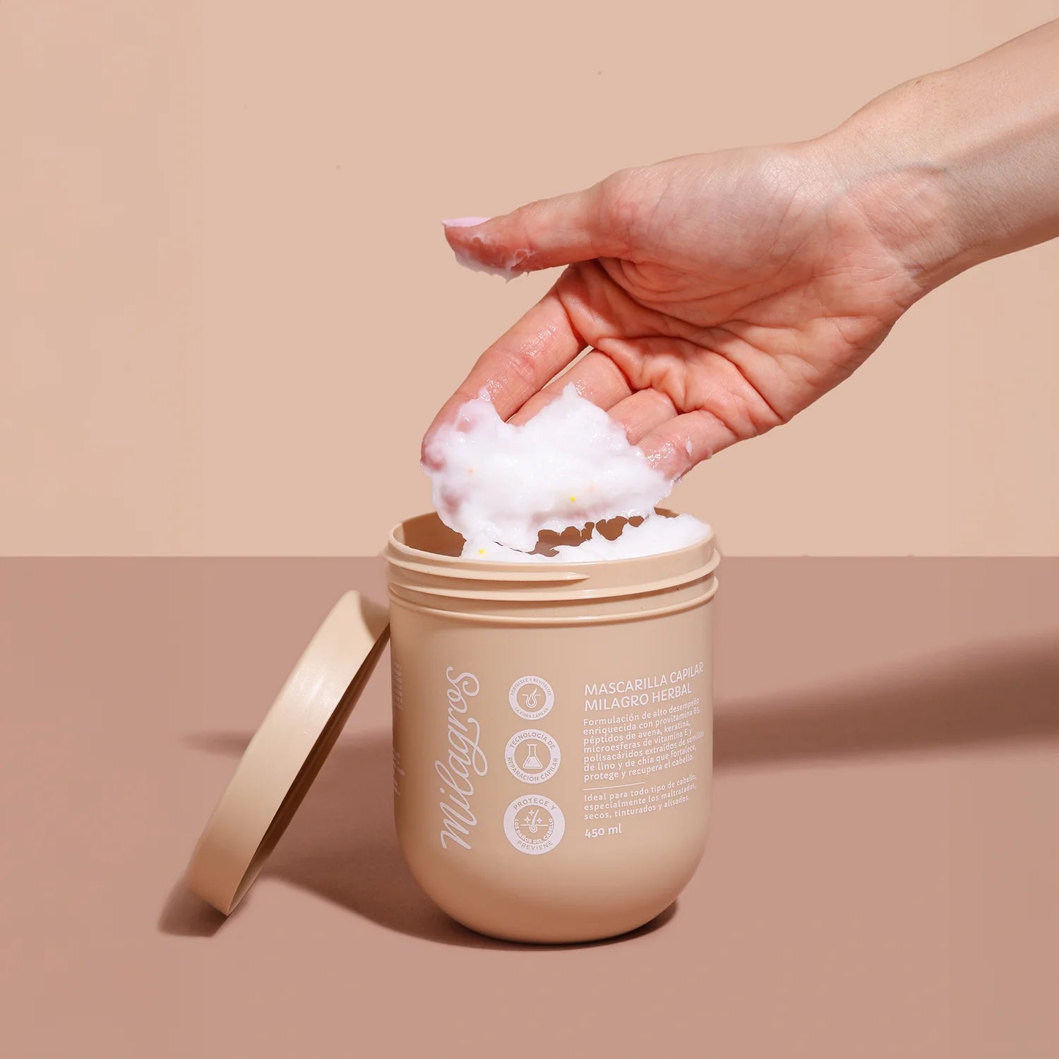 La mascarilla capilar de Milagros es una fórmula de alto rendimiento enriquecida con provitamina B5, péptidos de avena, queratina, microesferas de vitamina E y polisacáridos extraídos de semillas de lino y chía, diseñada para fortalecer, proteger y restaurar el cabello.
